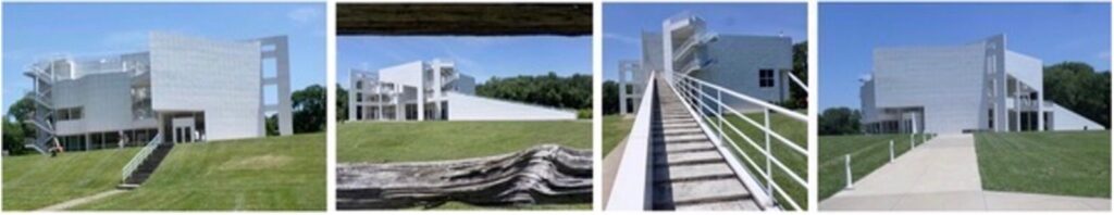 Next to Roofless Church on the same historic street is Atheneum Designed by internationally acclaimed architect Richard Meier, the Atheneum has received numerous design awards, including the Progressive Architecture Award for 1979, the American Institute of Architects Award in 1982, and the Twenty-five Year Award in 2008. The stunning building, which serves as the Visitors Center for New Harmony, houses exhibits on the communal history of New Harmony, a large theater where an orientation film on the town is shown, and the Museum Shop. Tours of the Atheneum which includes watching the film and several exhibits are available to the public through a donation. This house looks different from four angles. Thanx to my son Saleel…