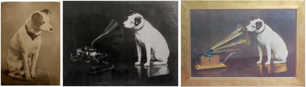 1) Nipper (photograph by Barraud, Liverpool and Oxford Street, London)… 2) The original picture with a phonograph as shown in Barraud’s copyright photograph of 1899… 3) The famous Nipper picture as revised for the Gramophone Company from an oleograph